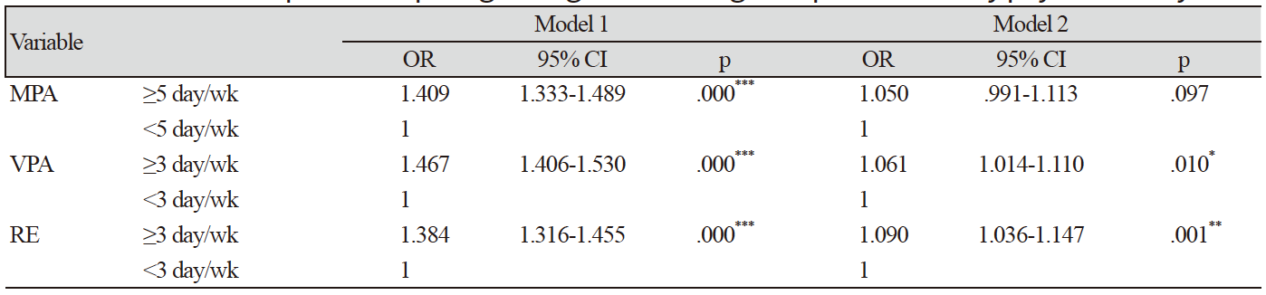 This study aimed to investigate the relationship between physical activity levels and sleep satisfaction among Korean adolescents using data from the 2024 Korea Youth Risk Behavior Survey. We analyzed raw data from the 2024 Korea ......